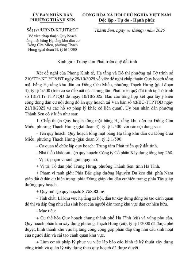 Công bố quy hoạch hạ tầng khu dân cư Đồng Cửa Miếu (Thạch Hưng cũ) giai đoạn 3Ẩn danh19/11/2025A -A+Ẩn danh19/11/2025A -A+ File đính kèmQH Đồng Cửa Miếu.rar