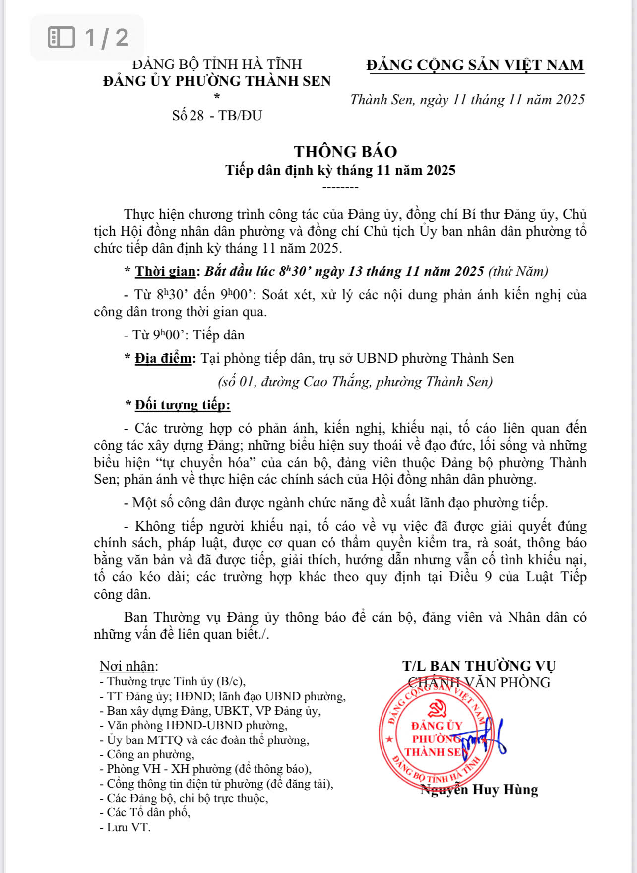 * Thời gian: Bắt đầu lúc 8h30’ ngày 13 tháng 11 năm 2025 (thứ Năm) - Từ 8h30’ đến 9h00’: Soát xét, xử lý các nội dung phản ánh kiến nghị của công dân trong thời gian qua.