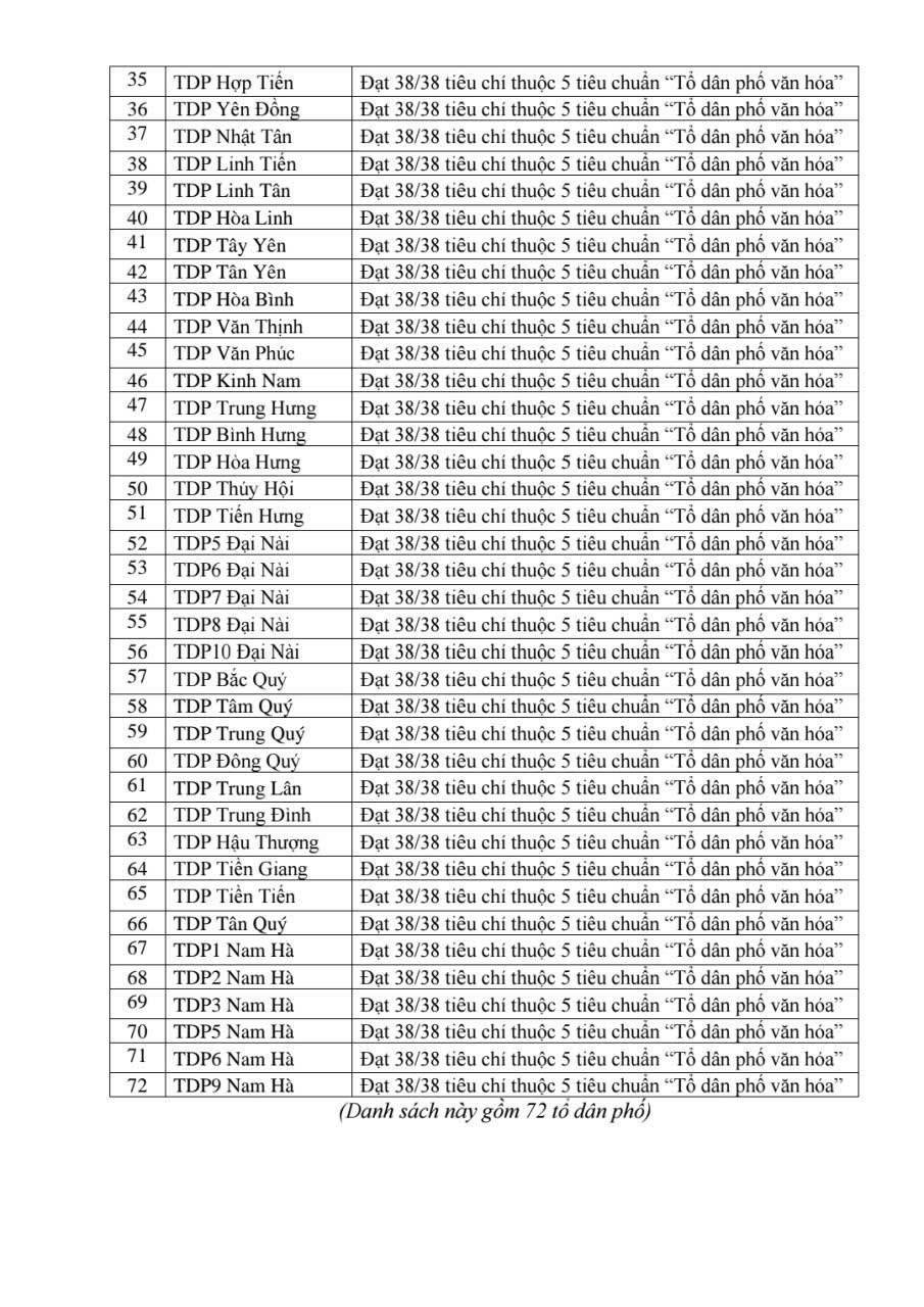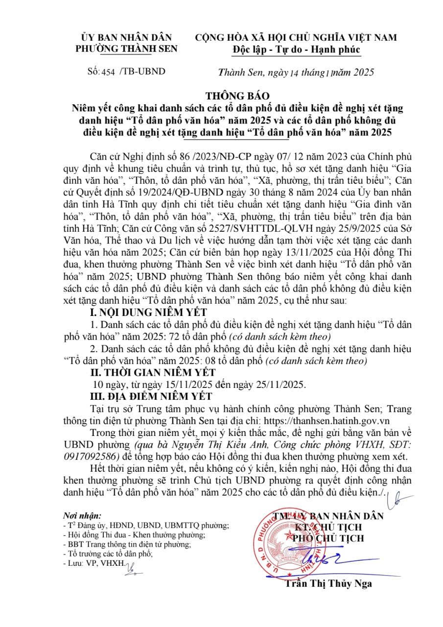 Uỷ ban nhân dân phường Thành Sen thông báo niêm yết công khai danh sách các tổ dân phố đủ điều kiện đề nghị xét tặng danh hiệu “Tổ dân phố văn hóa” năm 2025 và các tổ dân phố không đủ điều kiện đề nghị xét tặng danh hiệu “Tổ dân phố văn hóa” năm 2025
