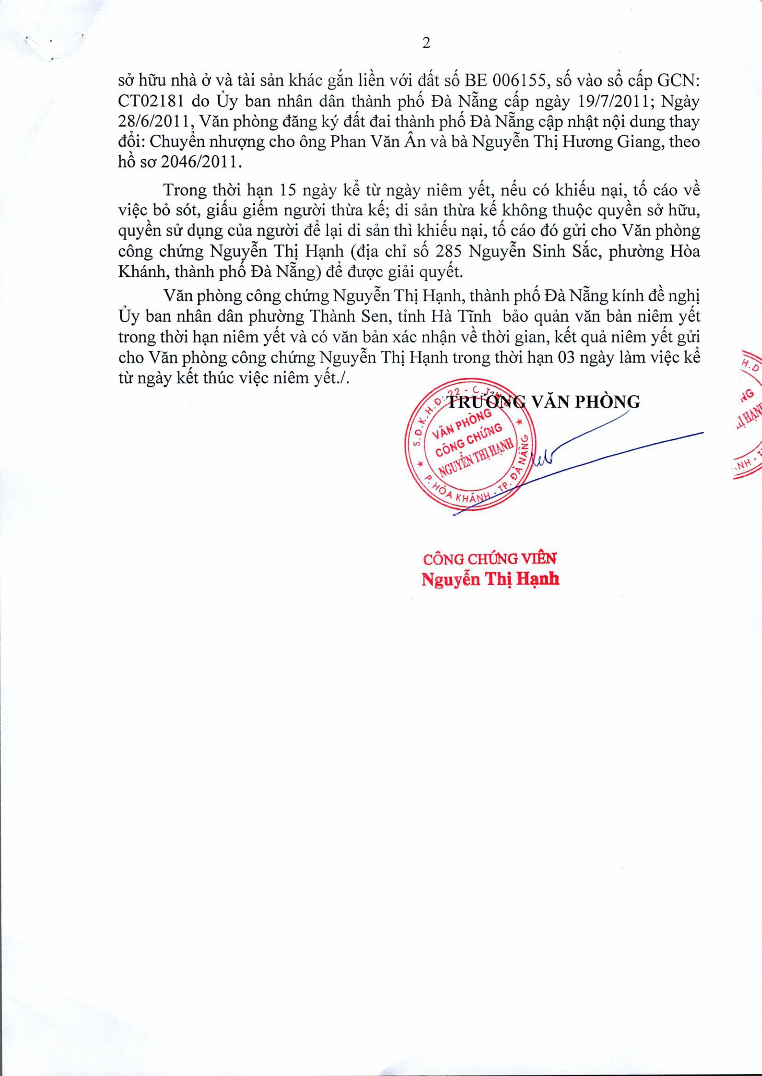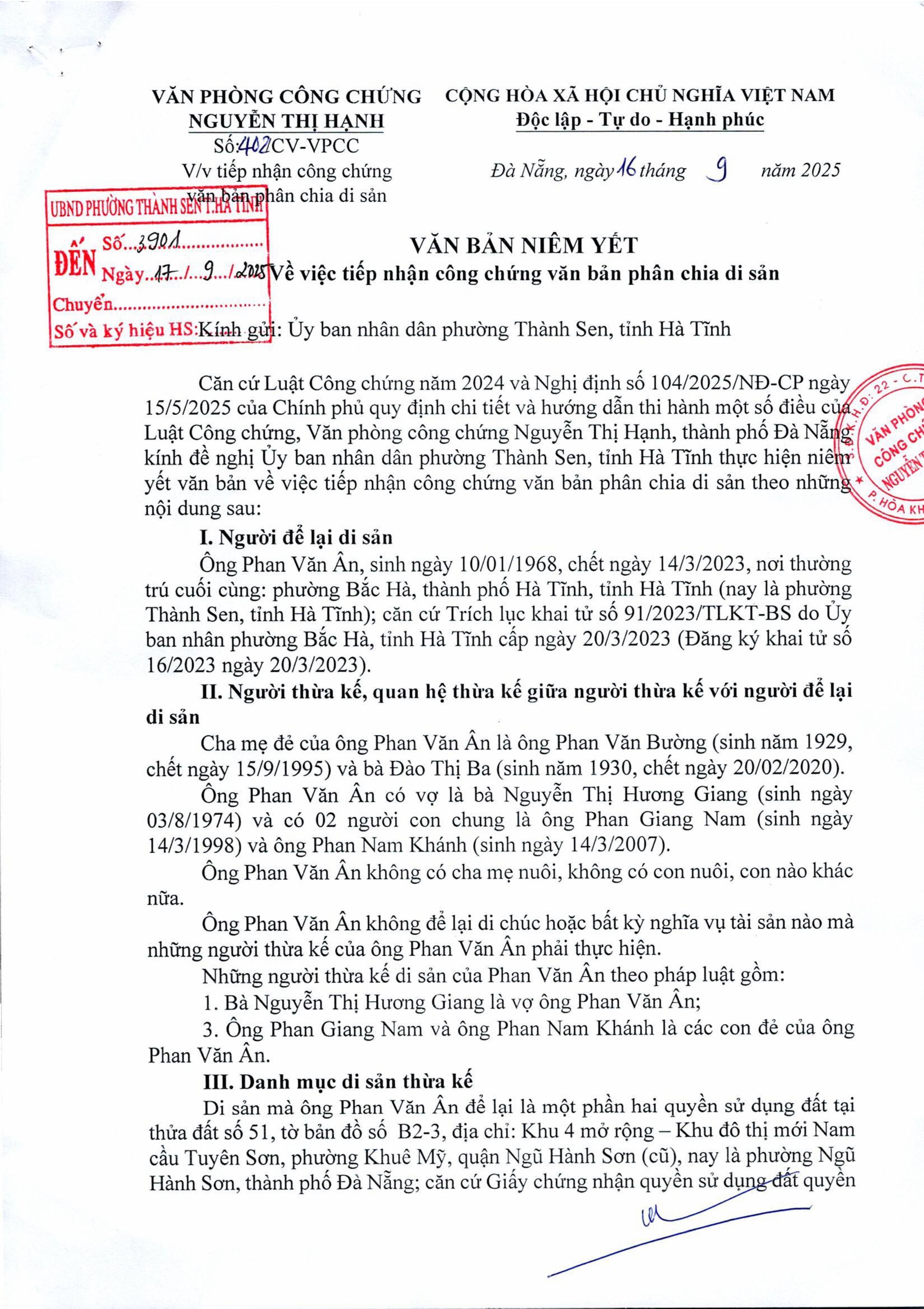 Văn phòng Công chứng Nguyễn Thị Hạnh (địa chỉ: phường Hòa Khánh, thành phố Đã Nẵng) thông báo niêm yết việc tiếp nhận công chứng văn bản phân chia di sản (Người để lại di sản: ông Phan Văn Ân) Thời gian niêm yết: 15 ngày (kể từ ngày 18/9/2025 đến hết ngày 02/10/2025) Địa điểm niêm yết: Trung tâm Phục vụ hành chính công phường Thành Sen (địa chỉ: số 11 đường Nguyễn Công Trứ, phường Thành Sen, tỉnh Hà Tĩnh)
